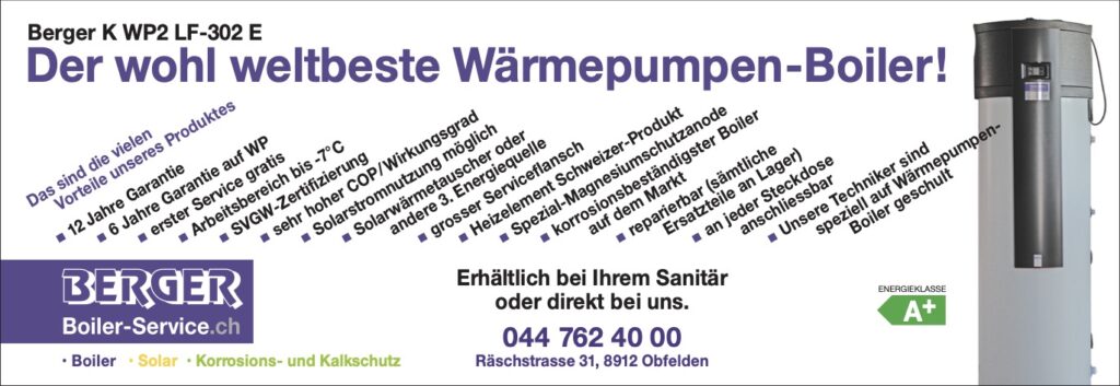 Willkommen bei der Berger Boiler-Service AG Wählen Sie Ihren Bereich Hauseigentümer, Verwaltungen und Mieter Installateure Für welches Thema interessieren Sie sich? Boiler-Service und -Entkalkung Boiler-Reparatur und -Ersatz Erneuerbare Energie mit Solar Geld sparen dank Korrosions- & Kalkschutz Ersatzteile für Boiler bestellen Serviceformular / Offertenanfrage Die Berger Boiler-Service AG Über uns Kontakt Referenzen News Prospekt Berger Solar-WP Boiler 600 SWS 3 1. Juni 202523. Juni 2025 Padelplatz Eröffnung 17. Mai 202523. Juni 2025 Jobs Sachbearbeiter/in Solar (60%-100%) 8. Oktober 20258. Oktober 2025
